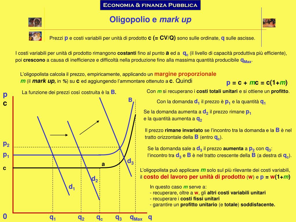 Economia & finanza Pubblica. Oligopolio e mark up. Prezzi p e costi variabili per unità di prodotto c (= CV/Q) sono sulle ordinate, q sulle ascisse.
