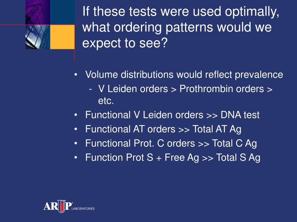 If these tests were used optimally, what ordering patterns would we expect to see? • Volume distributions would reflect prevalence • V Leiden orders > Prothrombin orders > etc. • Functional V Leiden orders >> DNA test • Functional AT orders >> Total AT Ag • Functional Prot. C orders >> Total C Ag • Function Prot S + Free Ag >> Total S Ag