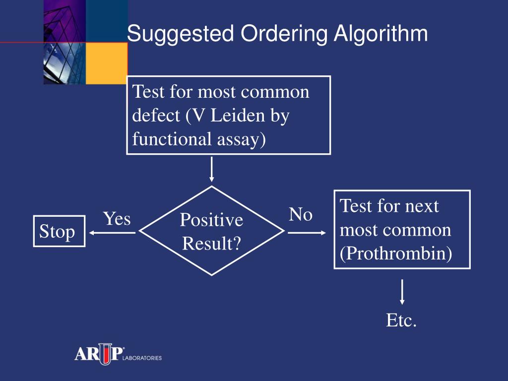 Suggested Ordering Algorithm Test for most common defect (V Leiden by functional assay) Positive Result? Test for next most common (Prothrombin) No Yes Stop Etc.