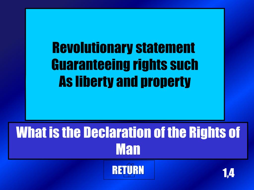 1,4 Revolutionary statement Guaranteeing rights such As liberty and property What is the Declaration of the Rights of Man Return