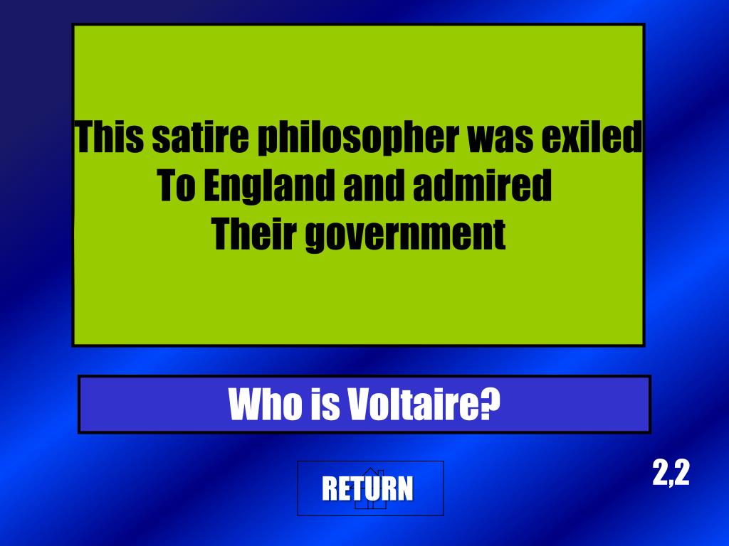 2,2 This satire philosopher was exiled To England and admired Their government Who is Voltaire? Return