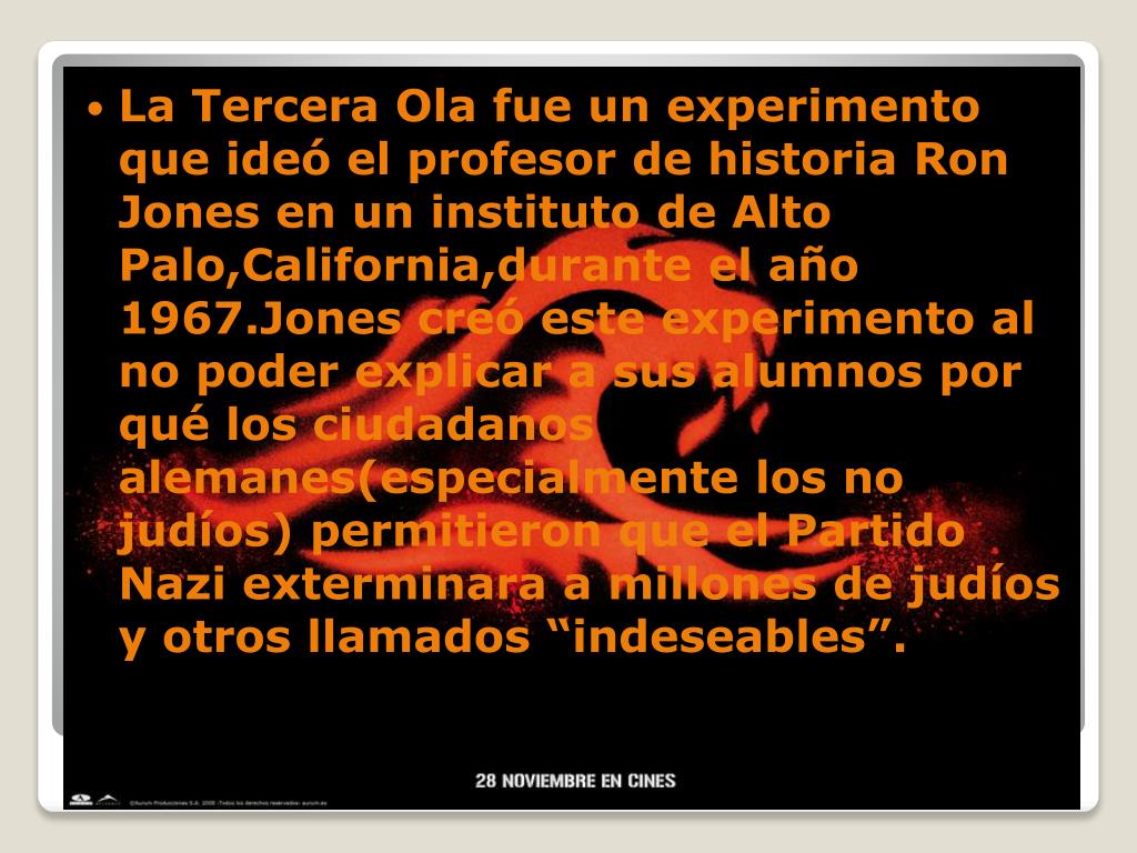 2. La Tercera Ola fue un experimento que ideó el profesor de historia Ron Jones en un instituto de Alto Palo,California,durante el año 1967.Jones creó este experimento al no poder explicar a sus alumnos por qué los ciudadanos alemanes(especialmente los no judíos) permitieron que el Partido Nazi exterminara a millones de judíos y otros llamados “indeseables”.