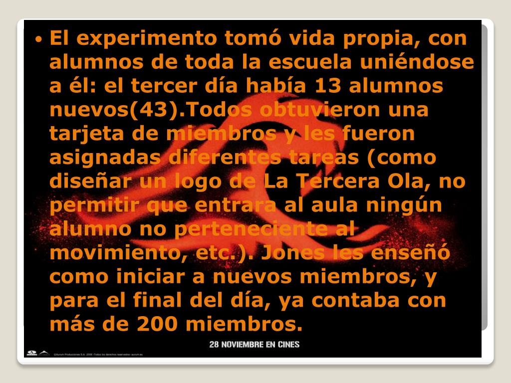 6. El experimento tomó vida propia, con alumnos de toda la escuela uniéndose a él: el tercer día había 13 alumnos nuevos(43).Todos obtuvieron una tarjeta de miembros y les fueron asignadas diferentes tareas (como diseñar un logo de La Tercera Ola, no permitir que entrara al aula ningún alumno no perteneciente al movimiento, etc.). Jones les enseñó como iniciar a nuevos miembros, y para el final del día, ya contaba con más de 200 miembros.