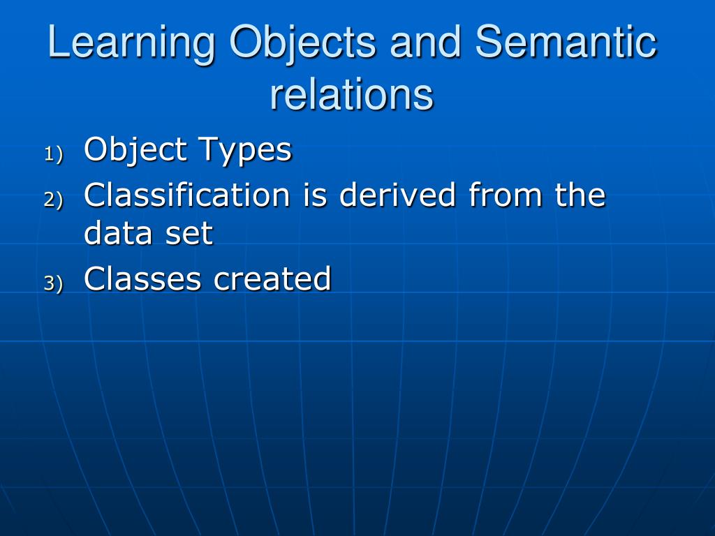 Learning Objects and Semantic relations Object Types Classification is derived from the data set Classes created