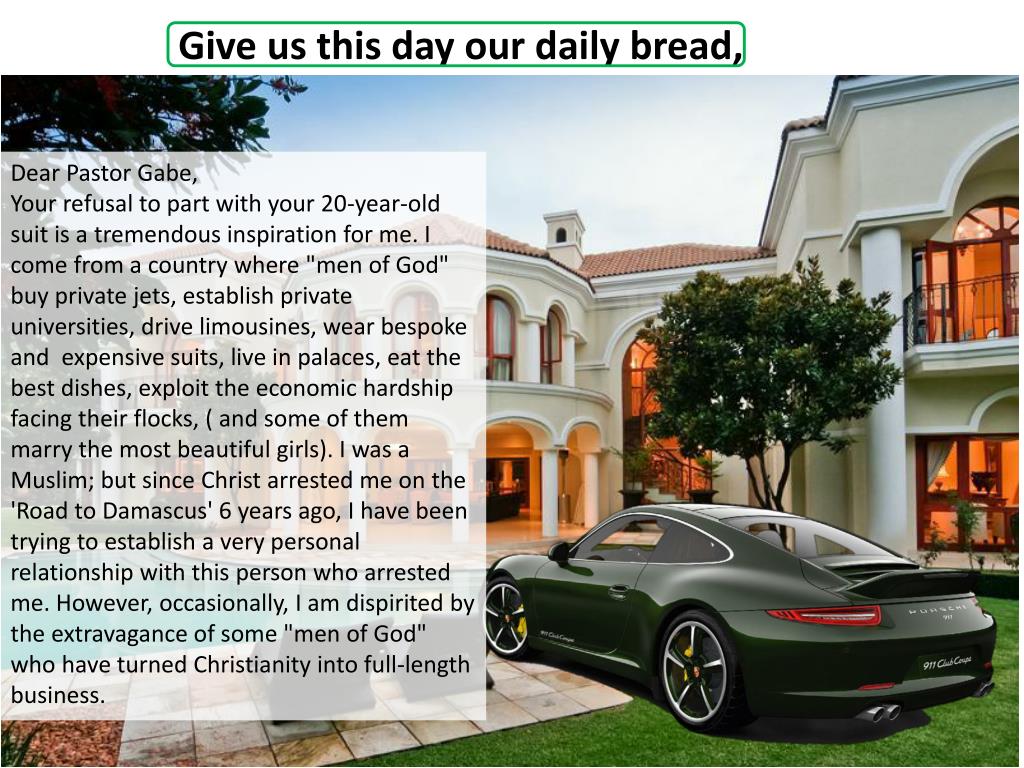 Give us this day our daily bread, Dear Pastor Gabe, Your refusal to part with your 20-year-old suit is a tremendous inspiration for me. I come from a country where "men of God" buy private jets, establish private universities, drive limousines, wear bespoke and expensive suits, live in palaces, eat the best dishes, exploit the economic hardship facing their flocks, ( and some of them marry the most beautiful girls). I was a Muslim; but since Christ arrested me on the 'Road to Damascus' 6 years ago, I have been trying to establish a very personal relationship with this person who arrested me. However, occasionally, I am dispirited by the extravagance of some "men of God" who have turned Christianity into full-length business.