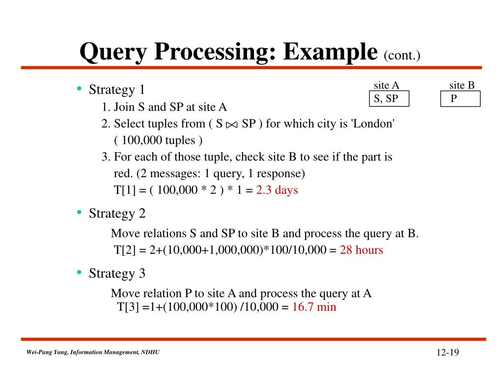 site A site B S, SP P Query Processing: Example(cont.) • Strategy 1 1. Join S and SP at site A 2. Select tuples from ( S SP ) for which city is 'London' ( 100,000 tuples ) 3. For each of those tuple, check site B to see if the part is red. (2 messages: 1 query, 1 response) T[1] = ( 100,000 * 2 ) * 1 = 2.3 days • Strategy 2 Move relations S and SP to site B and process the query at B. T[2] = 2+(10,000+1,000,000)*100/10,000 = 28 hours • Strategy 3 Move relation P to site A and process the query at A T[3] =1+(100,000*100) /10,000 = 16.7 min