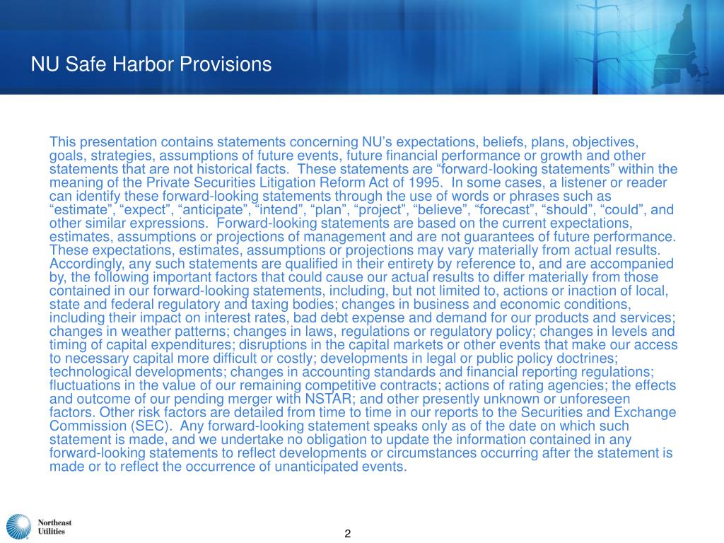 NU Safe Harbor Provisions This presentation contains statements concerning NU’s expectations, beliefs, plans, objectives, goals, strategies, assumptions of future events, future financial performance or growth and other statements that are not historical facts. These statements are “forward-looking statements” within the meaning of the Private Securities Litigation Reform Act of 1995. In some cases, a listener or reader can identify these forward-looking statements through the use of words or phrases such as “estimate”, “expect”, “anticipate”, “intend”, “plan”, “project”, “believe”, “forecast”, “should”, “could”, and other similar expressions. Forward-looking statements are based on the current expectations, estimates, assumptions or projections of management and are not guarantees of future performance. These expectations, estimates, assumptions or projections may vary materially from actual results. Accordingly, any such statements are qualified in their entirety by reference to, and are accompanied by, the following important factors that could cause our actual results to differ materially from those contained in our forward-looking statements, including, but not limited to, actions or inaction of local, state and federal regulatory and taxing bodies; changes in business and economic conditions, including their impact on interest rates, bad debt expense and demand for our products and services; changes in weather patterns; changes in laws, regulations or regulatory policy; changes in levels and timing of capital expenditures; disruptions in the capital markets or other events that make our access to necessary capital more difficult or costly; developments in legal or public policy doctrines; technological developments; changes in accounting standards and financial reporting regulations; fluctuations in the value of our remaining competitive contracts; actions of rating agencies; the effects and outcome of our pending merger with NSTAR; and other presently unknown or unforeseen factors. Other risk factors are detailed from time to time in our reports to the Securities and Exchange Commission (SEC). Any forward-looking statement speaks only as of the date on which such statement is made, and we undertake no obligation to update the information contained in any forward-looking statements to reflect developments or circumstances occurring after the statement is made or to reflect the occurrence of unanticipated events.
