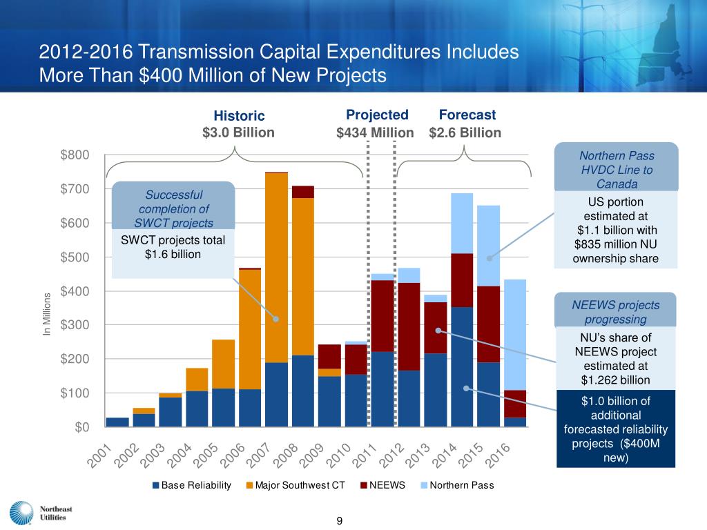 2012-2016 Transmission Capital Expenditures Includes More Than $400 Million of New Projects Projected Forecast Historic $3.0 Billion $434 Million $2.6 Billion Northern Pass HVDC Line to Canada Successful completion of SWCT projects US portion estimated at $1.1 billion with $835 million NU ownership share SWCT projects total $1.6 billion NEEWS projects progressing In Millions NU’s share of NEEWS project estimated at $1.262 billion $1.0 billion of additional forecasted reliability projects ($400M new)