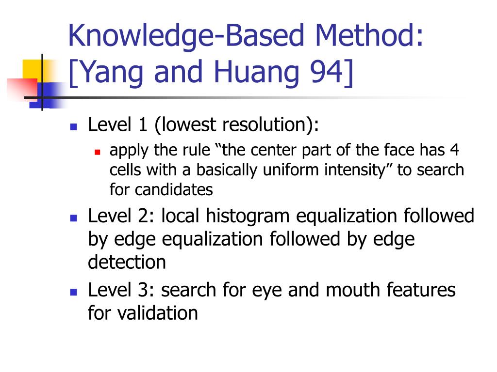 Knowledge-Based Method: [Yang and Huang 94] • Level 1 (lowest resolution): • apply the rule “the center part of the face has 4 cells with a basically uniform intensity” to search for candidates • Level 2: local histogram equalization followed by edge equalization followed by edge detection • Level 3: search for eye and mouth features for validation