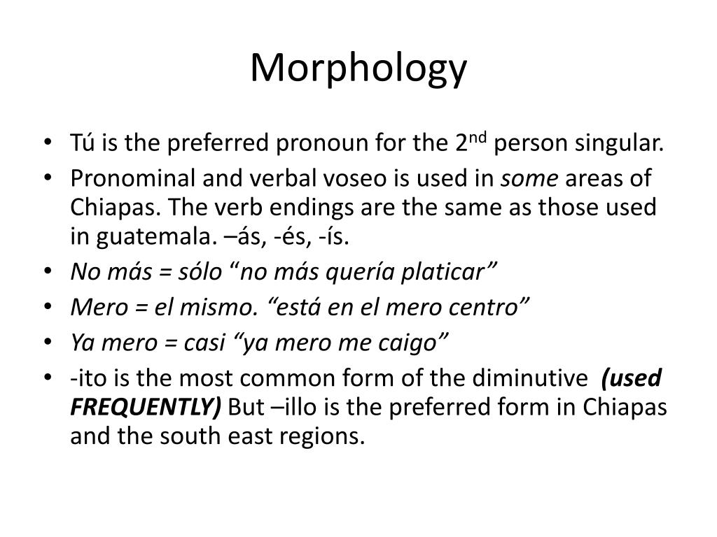 Morphology • Tú is the preferred pronoun for the 2nd person singular. • Pronominal and verbal voseo is used in some areas of Chiapas. The verb endings are the same as those used in guatemala. –ás, -és, -ís. • No más = sólo“no másqueríaplaticar” • Mero = el mismo. “está en el merocentro” • Yamero = casi “yamero me caigo” • -ito is the most common form of the diminutive (used FREQUENTLY) But –illo is the preferred form in Chiapas and the south east regions.