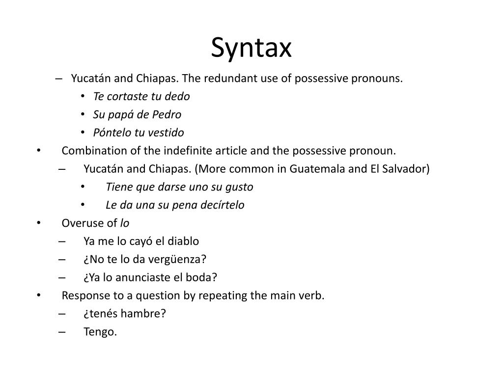 Syntax • Yucatán and Chiapas. The redundant use of possessive pronouns. • Tecortastetudedo • Su papá de Pedro • Póntelotuvestido • Combination of the indefinite article and the possessive pronoun. • Yucatán and Chiapas. (More common in Guatemala and El Salvador) • Tienequedarseunosu gusto • Le da unasupenadecírtelo • Overuse of lo • Ya me lo cayó el diablo • ¿No te lo da vergüenza? • ¿Ya lo anunciaste el boda? • Response to a question by repeating the main verb. • ¿tenéshambre? • Tengo.