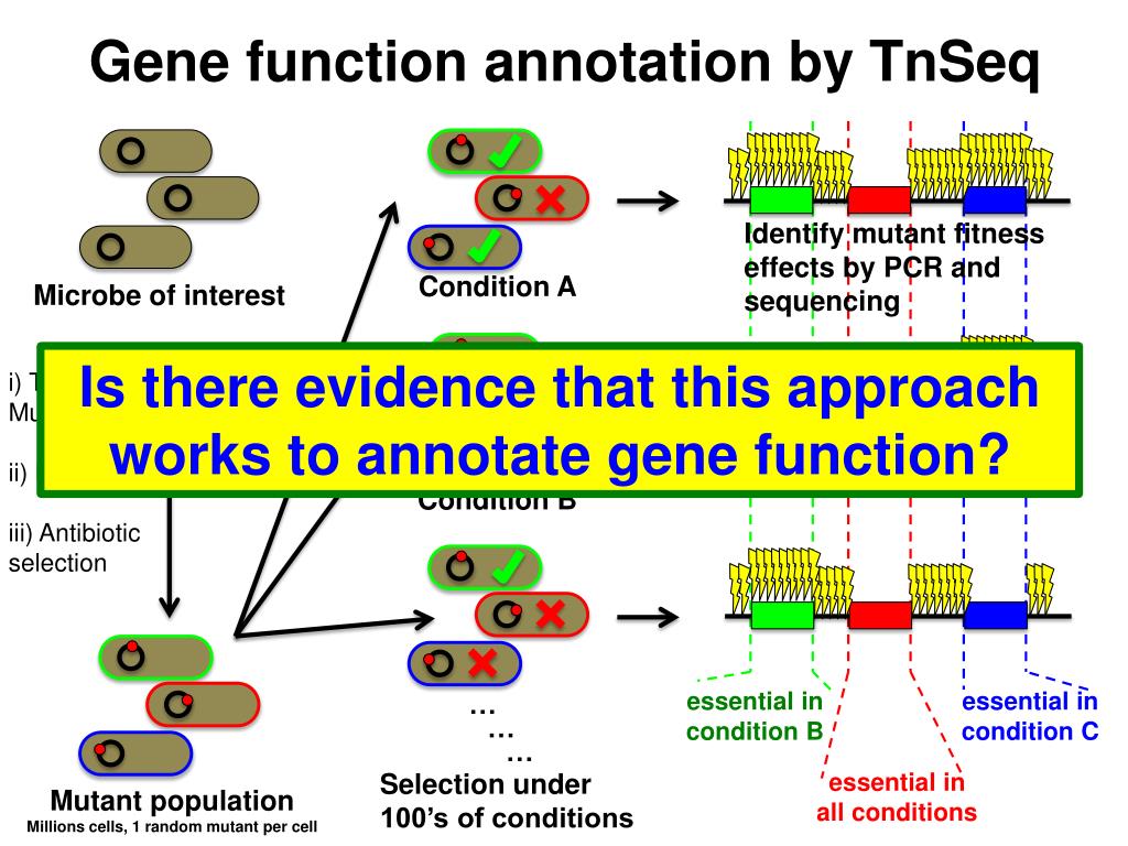 Gene function annotation by TnSeq Identify mutant fitness effects by PCR and sequencing Condition A Microbe of interest Is there evidence that this approach works to annotate gene function? i) Transposon Mutagenesis ii) Recovery iii) Antibiotic selection Condition B essential in condition B essential in condition C … … … Selection under 100’s of conditions essential in all conditions Mutant population Millions cells, 1 random mutant per cell