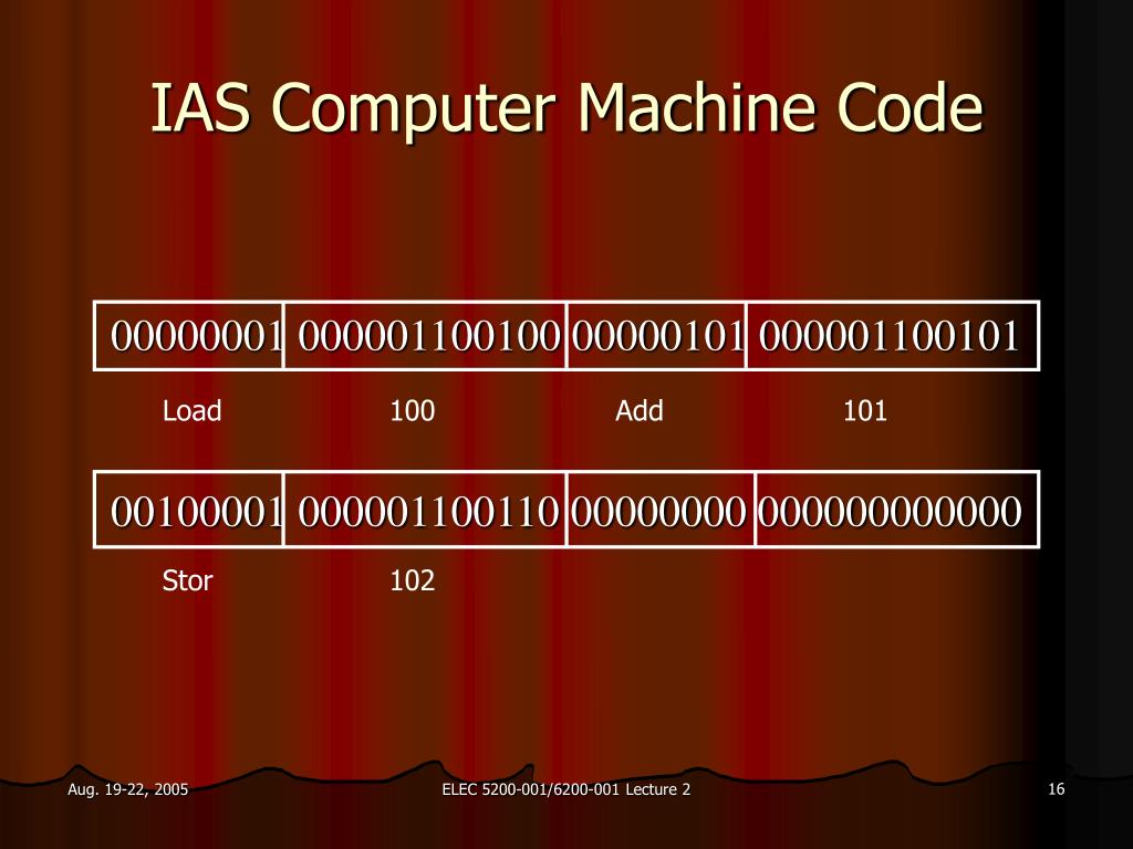 IAS Computer Machine Code 00000001 000001100100 00000101 000001100101 Load 100 Add 101 00100001 000001100110 00000000 000000000000 Stor 102 ELEC 5200-001/6200-001 Lecture 2
