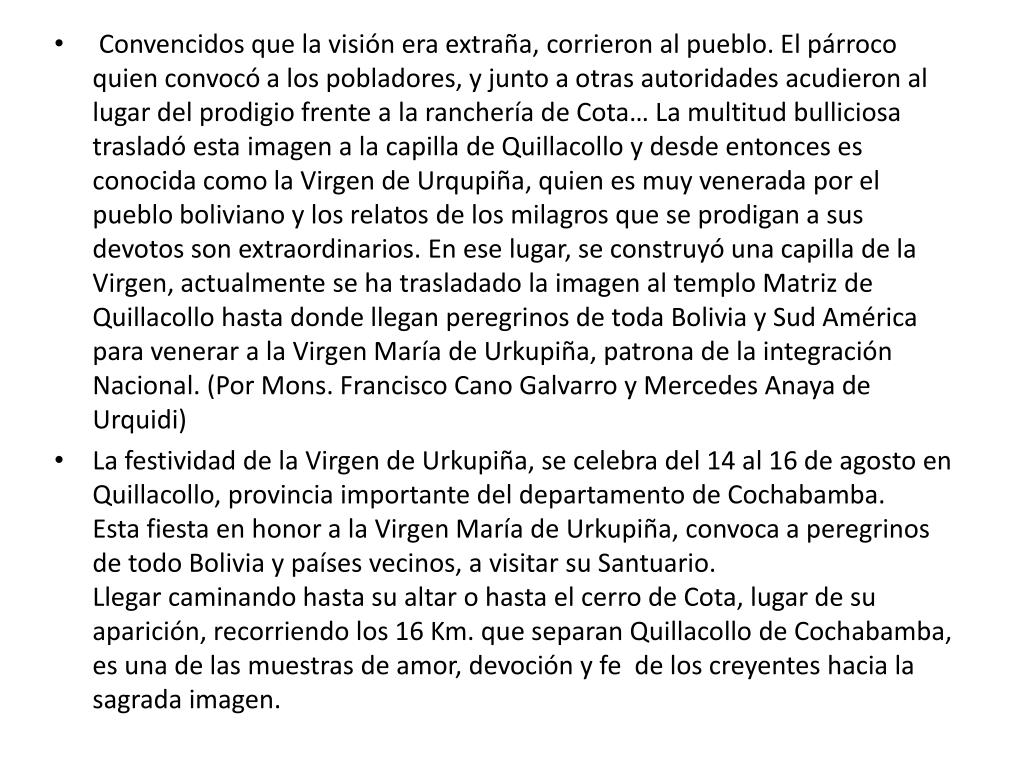 Convencidos que la visión era extraña, corrieron al pueblo. El párroco quien convocó a los pobladores, y junto a otras autoridades acudieron al lugar del prodigio frente a la ranchería de Cota… La multitud bulliciosa trasladó esta imagen a la capilla de Quillacollo y desde entonces es conocida como la Virgen de Urqupiña, quien es muy venerada por el pueblo boliviano y los relatos de los milagros que se prodigan a sus devotos son extraordinarios. En ese lugar, se construyó una capilla de la Virgen, actualmente se ha trasladado la imagen al templo Matriz de Quillacollo hasta donde llegan peregrinos de toda Bolivia y Sud América para venerar a la Virgen María de Urkupiña, patrona de la integración Nacional. (Por Mons. Francisco Cano Galvarro y Mercedes Anaya de Urquidi) • La festividad de la Virgen de Urkupiña, se celebra del 14 al 16 de agosto en Quillacollo, provincia importante del departamento de Cochabamba. Esta fiesta en honor a la Virgen María de Urkupiña, convoca a peregrinos de todo Bolivia y países vecinos, a visitar su Santuario. Llegar caminando hasta su altar o hasta el cerro de Cota, lugar de su aparición, recorriendo los 16 Km. que separan Quillacollo de Cochabamba, es una de las muestras de amor, devoción y fe de los creyentes hacia la sagrada imagen.
