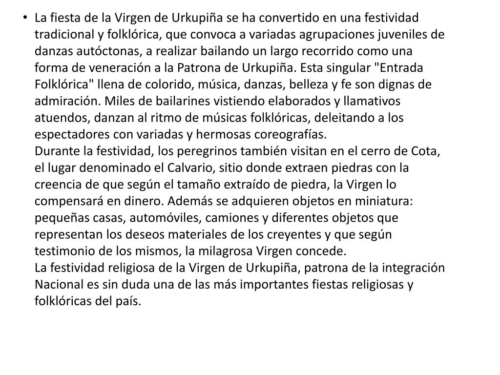 La fiesta de la Virgen de Urkupiña se ha convertido en una festividad tradicional y folklórica, que convoca a variadas agrupaciones juveniles de danzas autóctonas, a realizar bailando un largo recorrido como una forma de veneración a la Patrona de Urkupiña. Esta singular "Entrada Folklórica" llena de colorido, música, danzas, belleza y fe son dignas de admiración. Miles de bailarines vistiendo elaborados y llamativos atuendos, danzan al ritmo de músicas folklóricas, deleitando a los espectadores con variadas y hermosas coreografías. Durante la festividad, los peregrinos también visitan en el cerro de Cota, el lugar denominado el Calvario, sitio donde extraen piedras con la creencia de que según el tamaño extraído de piedra, la Virgen lo compensará en dinero. Además se adquieren objetos en miniatura: pequeñas casas, automóviles, camiones y diferentes objetos que representan los deseos materiales de los creyentes y que según testimonio de los mismos, la milagrosa Virgen concede. La festividad religiosa de la Virgen de Urkupiña, patrona de la integración Nacional es sin duda una de las más importantes fiestas religiosas y folklóricas del país.