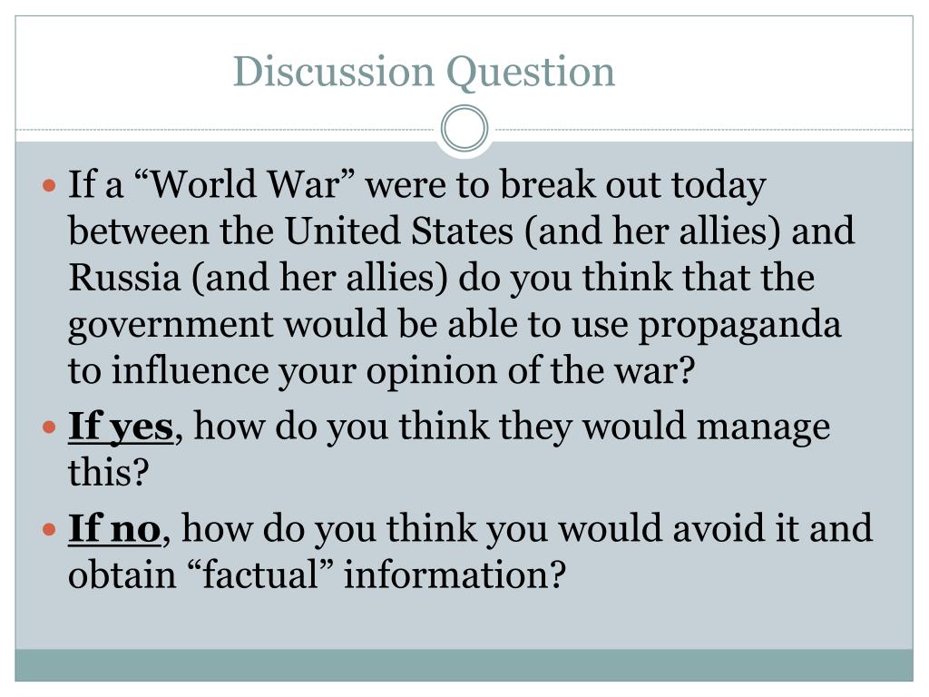 Discussion Question If a “World War” were to break out today between the United States (and her allies) and Russia (and her allies) do you think that the government would be able to use propaganda to influence your opinion of the war? If yes, how do you think they would manage this? If no, how do you think you would avoid it and obtain “factual” information?