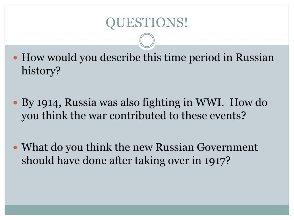QUESTIONS! How would you describe this time period in Russian history? By 1914, Russia was also fighting in WWI. How do you think the war contributed to these events? What do you think the new Russian Government should have done after taking over in 1917?