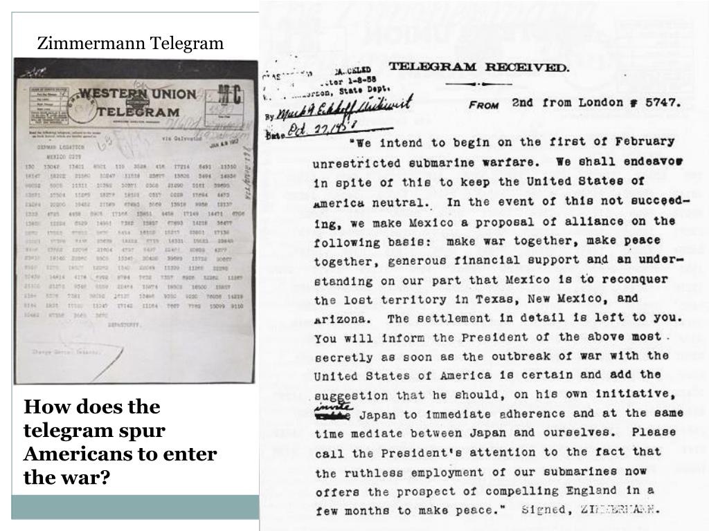 U.S. Declares War • Join Allies • Strong cultural ties • Share language with Britain • Respect France as another democracy • February 1, 1917: Germany announced they would resume unrestricted submarine warfare • Wilson denounced Germany • Britain intercepted Zimmerman Telegram to Mexico offering to help reconquer lost territory in New Mexico • Anti-German feeling intensified in U.S.