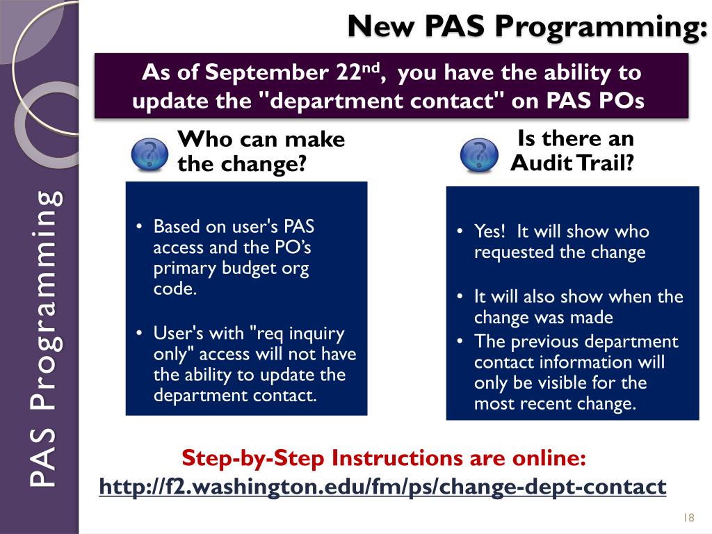 New PAS Programming: • As of September 22nd, you have the ability to update the "department contact" on PAS POs PAS Programming • Step-by-Step Instructions are online:http://f2.washington.edu/fm/ps/change-dept-contact