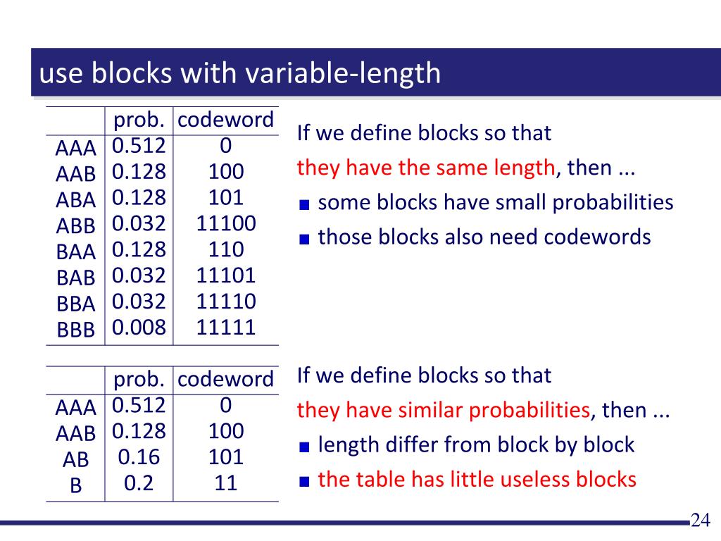 use blocks with variable-length prob. 0.512 0.128 0.128 0.032 0.128 0.032 0.032 0.008 codeword 0 100 101 11100 110 11101 11110 11111 If we define blocks so that they have the same length, then ... • some blocks have small probabilities • those blocks also need codewords If we define blocks so that they have similar probabilities, then ... • length differ from block by block • the table has little useless blocks AAA AAB ABA ABB BAA BAB BBA BBB prob. 0.512 0.128 0.16 0.2 codeword 0 100 101 11 AAA AAB AB B