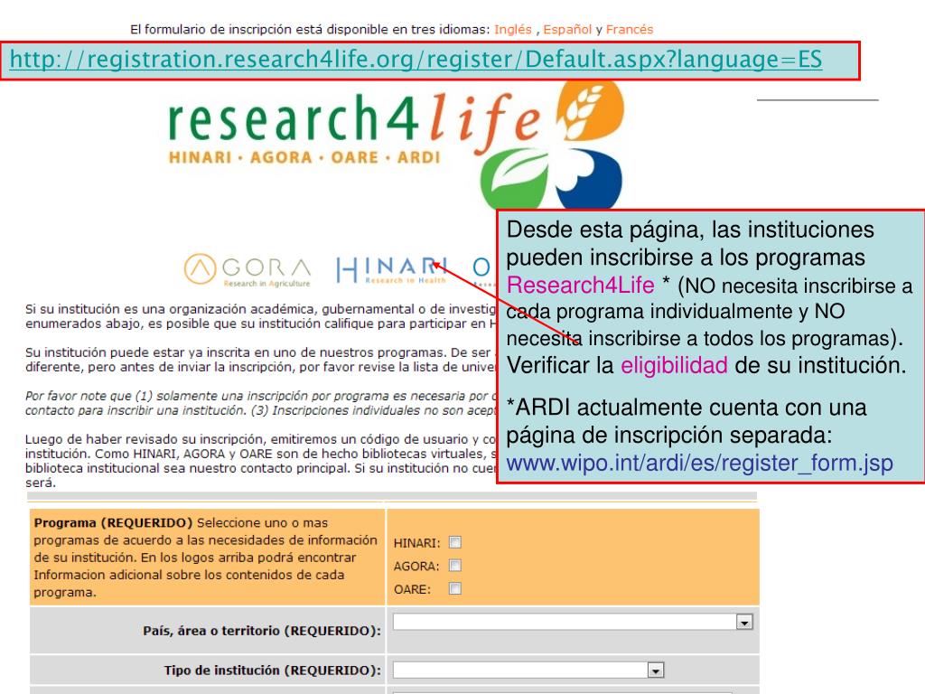 http://registration.research4life.org/register/Default.aspx?language=EShttp://registration.research4life.org/register/Default.aspx?language=ES Desde esta página, las instituciones pueden inscribirse a los programas Research4Life * (NO necesita inscribirse a cada programa individualmente y NO necesita inscribirse a todos los programas). Verificar la eligibilidad de su institución. *ARDI actualmente cuenta con una página de inscripción separada: www.wipo.int/ardi/es/register_form.jsp