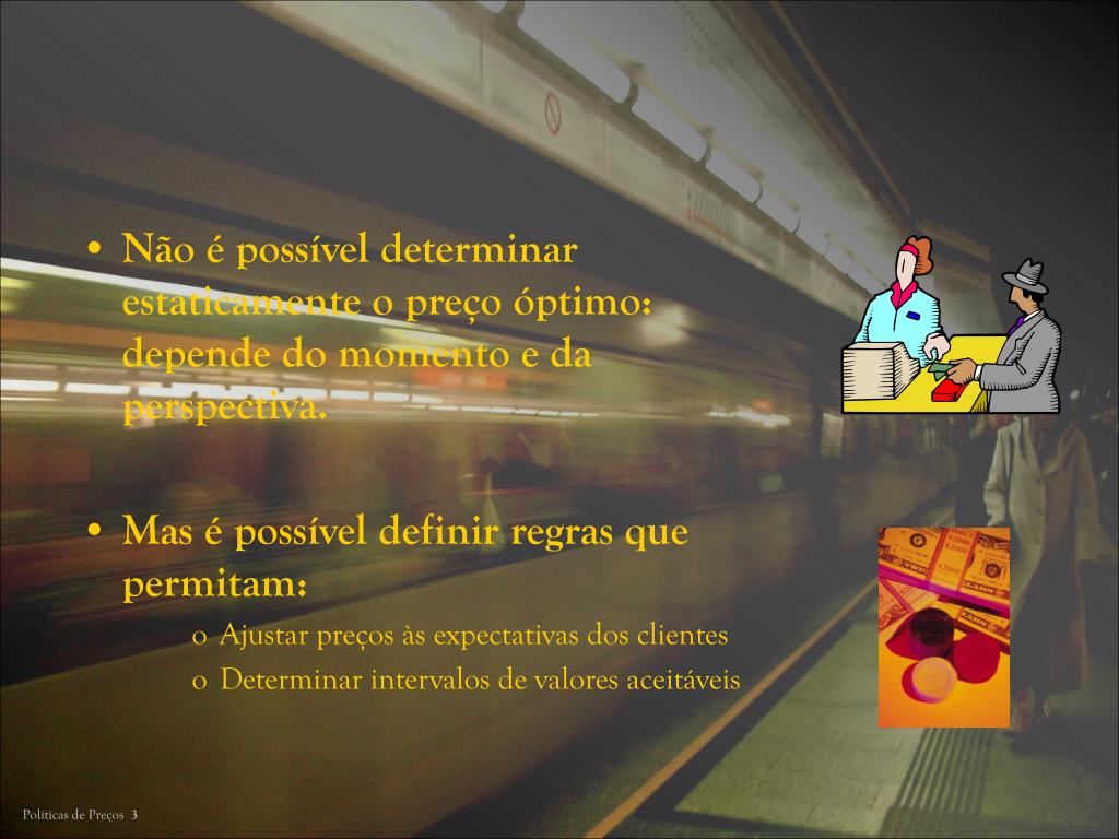 Não é possível determinar estaticamente o preço óptimo: depende do momento e da perspectiva. • Mas é possível definir regras que permitam: • Ajustar preços às expectativas dos clientes • Determinar intervalos de valores aceitáveis