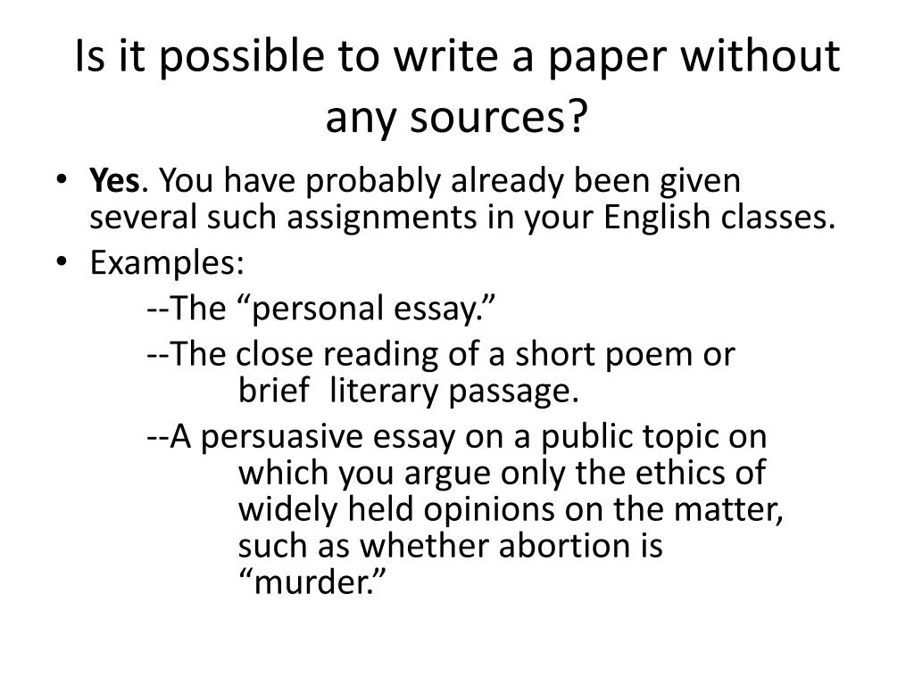 Is it possible to write a paper without any sources? • Yes. You have probably already been given several such assignments in your English classes. • Examples: --The “personal essay.” --The close reading of a short poem or brief literary passage. --A persuasive essay on a public topic on which you argue only the ethics of widely held opinions on the matter, such as whether abortion is “murder.”