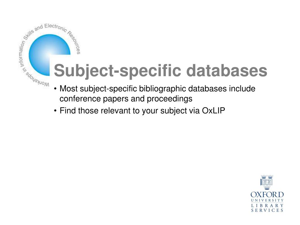 Subject-specific databases • Most subject-specific bibliographic databases include conference papers and proceedings • Find those relevant to your subject via OxLIP