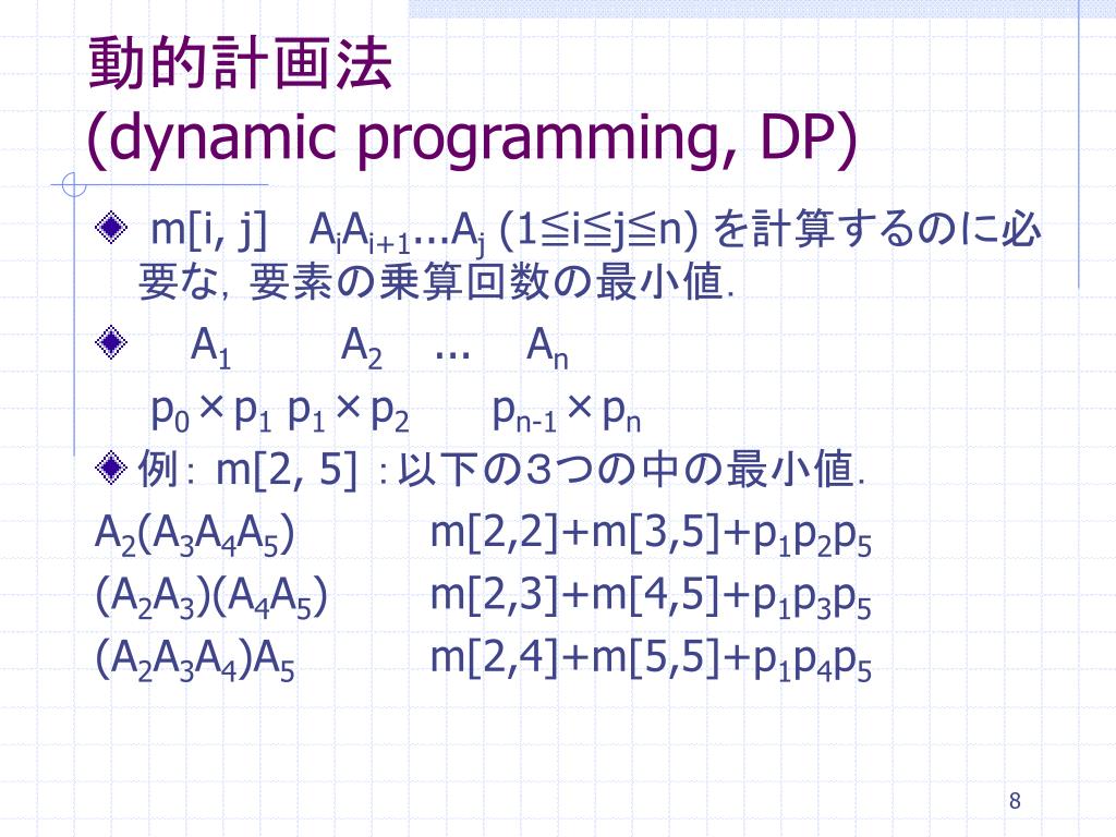 動的計画法(dynamic programming, DP) • m[i, j] AiAi+1...Aj (1≦i≦j≦n) を計算するのに必要な,要素の乗算回数の最小値. • A1 A2 ... An p0×p1 p1×p2 pn-1×pn • 例: m[2, 5] :以下の3つの中の最小値. A2(A3A4A5) m[2,2]+m[3,5]+p1p2p5 (A2A3)(A4A5) m[2,3]+m[4,5]+p1p3p5 (A2A3A4)A5 m[2,4]+m[5,5]+p1p4p5