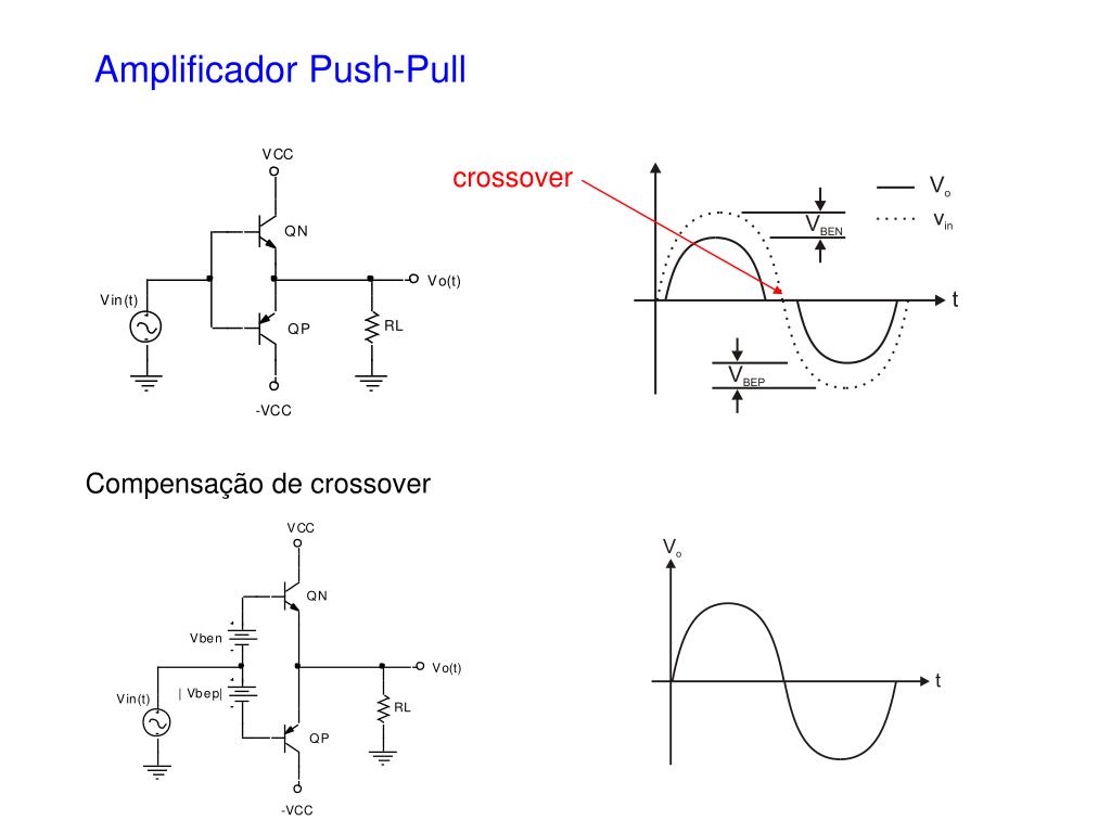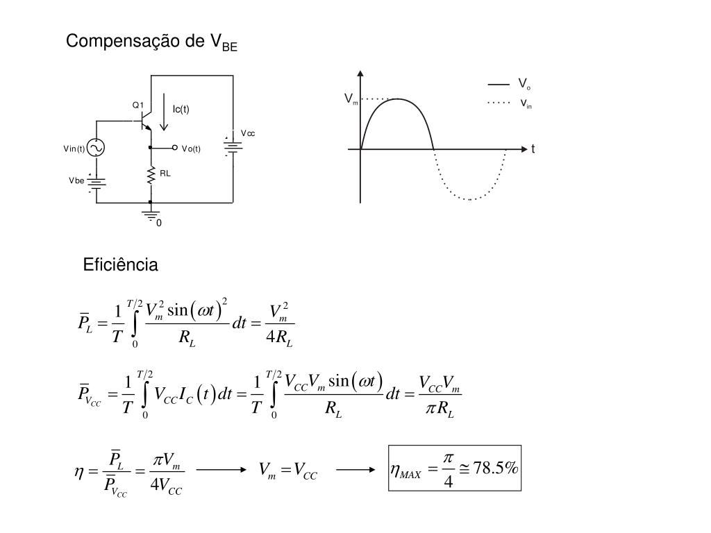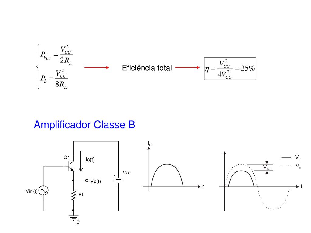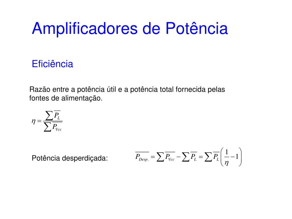 Amplificadores de Potência. Eficiência. Razão entre a potência útil e a potência total fornecida pelas fontes de alimentação. Potência desperdiçada:. Amplificador Classe A. Potência média fornecida pela fonte:. Potência média dissipada na carga:. Potência útil na carga .
