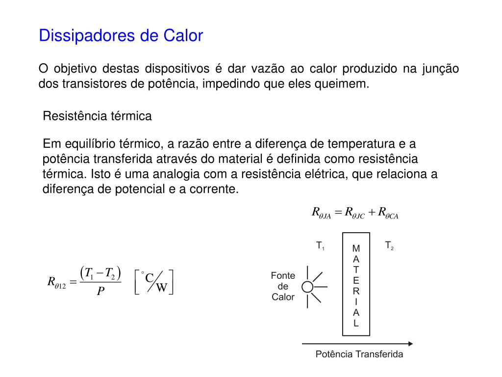 Dissipadores de Calor O objetivo destas dispositivos é dar vazão ao calor produzido na junção dos transistores de potência, impedindo que eles queimem. Resistência térmica Em equilíbrio térmico, a razão entre a diferença de temperatura e a potência transferida através do material é definida como resistência térmica. Isto é uma analogia com a resistência elétrica, que relaciona a diferença de potencial e a corrente.