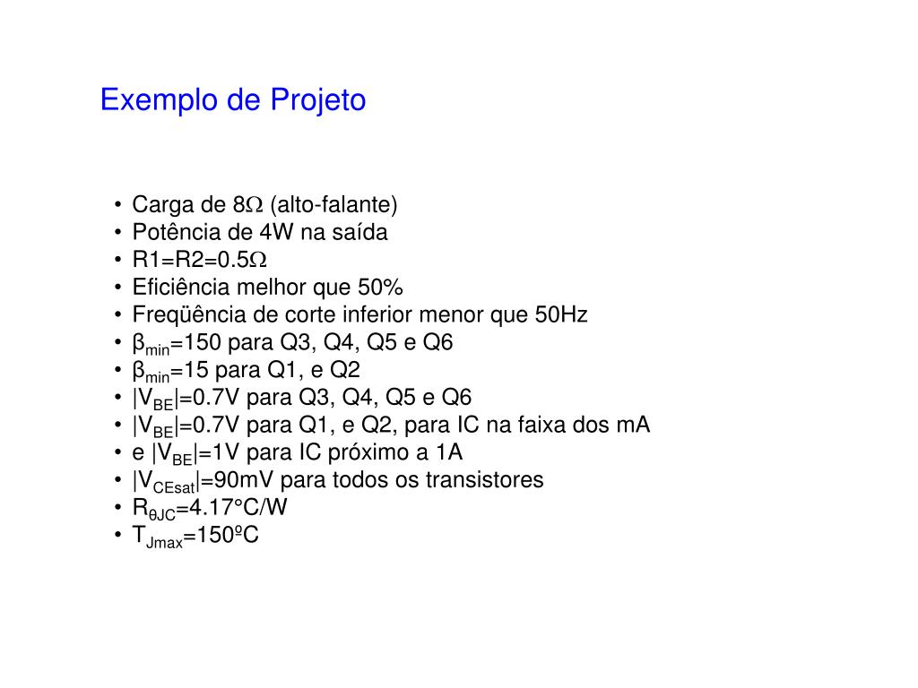 Exemplo de Projeto • Carga de 8 (alto-falante) • Potência de 4W na saída • R1=R2=0.5 • Eficiência melhor que 50% • Freqüência de corte inferior menor que 50Hz • βmin=150 para Q3, Q4, Q5 e Q6 • βmin=15 para Q1, e Q2 • |VBE|=0.7V para Q3, Q4, Q5 e Q6 • |VBE|=0.7V para Q1, e Q2, para IC na faixa dos mA • e |VBE|=1V para IC próximo a 1A • |VCEsat|=90mV para todos os transistores • RθJC=4.17°C/W • TJmax=150ºC