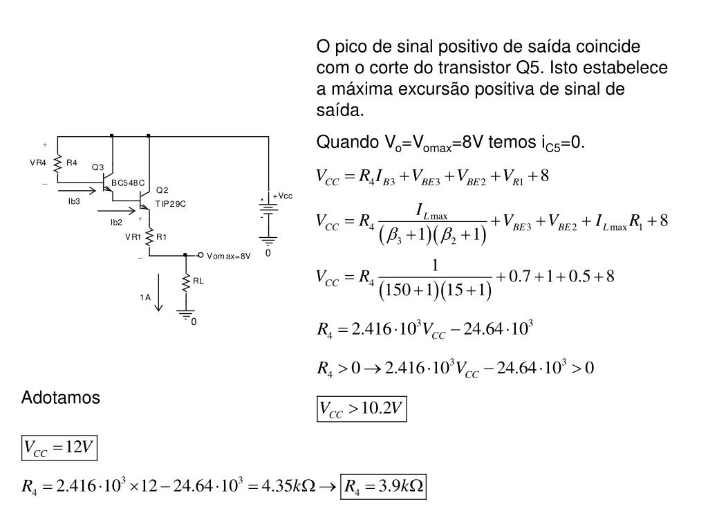 O pico de sinal positivo de saída coincide com o corte do transistor Q5. Isto estabelece a máxima excursão positiva de sinal de saída. Quando Vo=Vomax=8V temos iC5=0. Adotamos