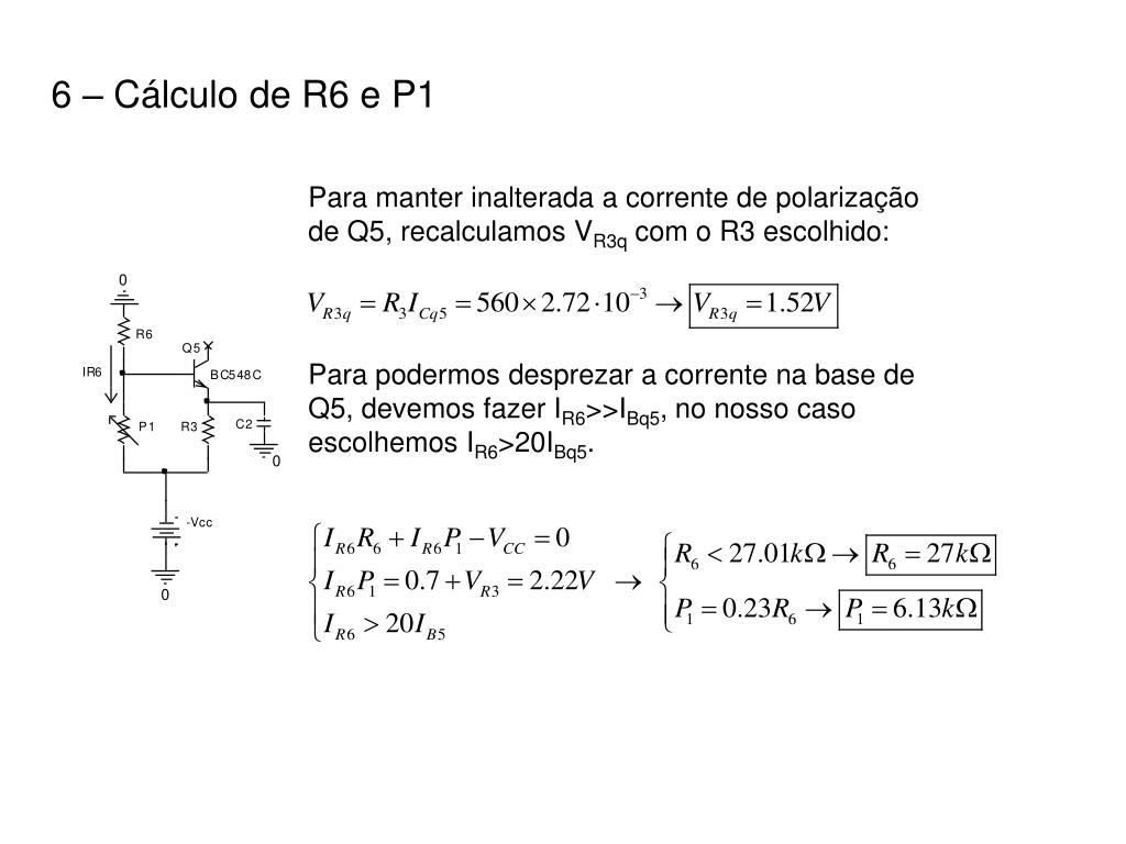 6 – Cálculo de R6 e P1 Para manter inalterada a corrente de polarização de Q5, recalculamos VR3q com o R3 escolhido: Para podermos desprezar a corrente na base de Q5, devemos fazer IR6>>IBq5, no nosso caso escolhemos IR6>20IBq5.