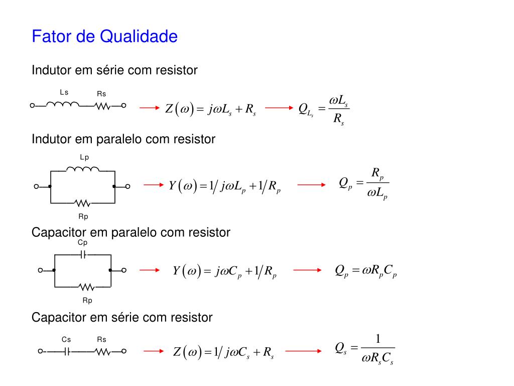 Fator de Qualidade Indutor em série com resistor Indutor em paralelo com resistor Capacitor em paralelo com resistor Capacitor em série com resistor