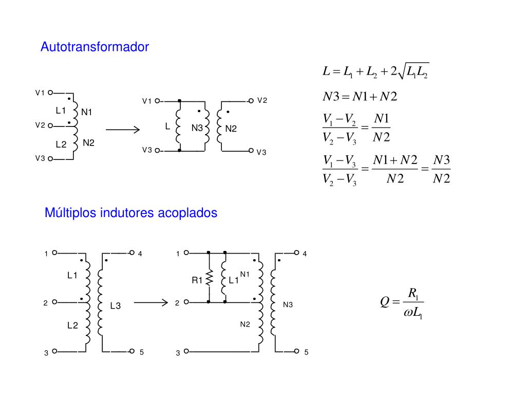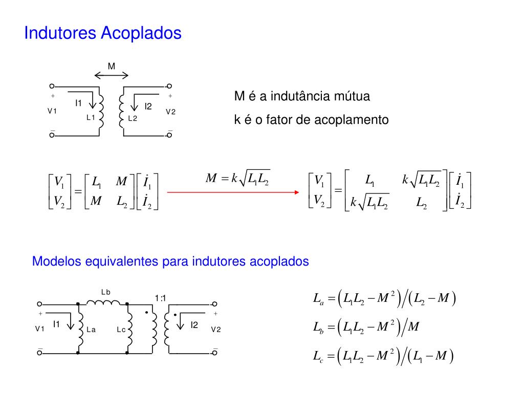 Indutores Acoplados M é a indutância mútua k é o fator de acoplamento Modelos equivalentes para indutores acoplados