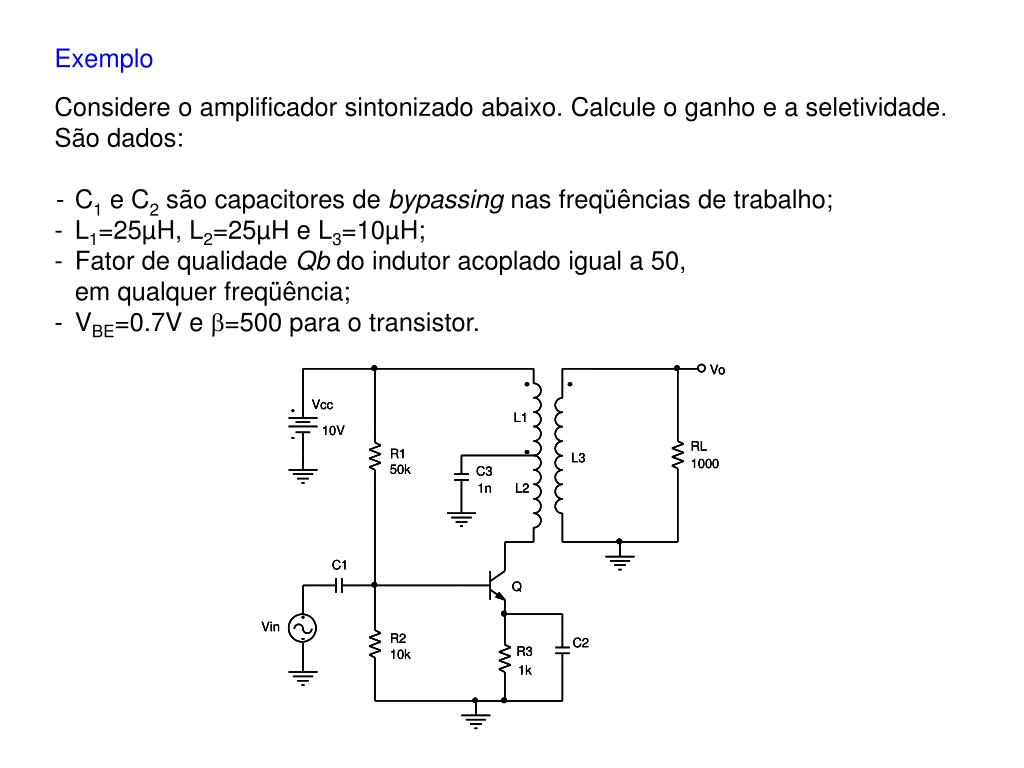Exemplo Considere o amplificador sintonizado abaixo. Calcule o ganho e a seletividade. São dados: - C1 e C2 são capacitores de bypassing nas freqüências de trabalho; - L1=25µH, L2=25µH e L3=10µH; - Fator de qualidade Qb do indutor acoplado igual a 50, em qualquer freqüência; - VBE=0.7V e =500 para o transistor.