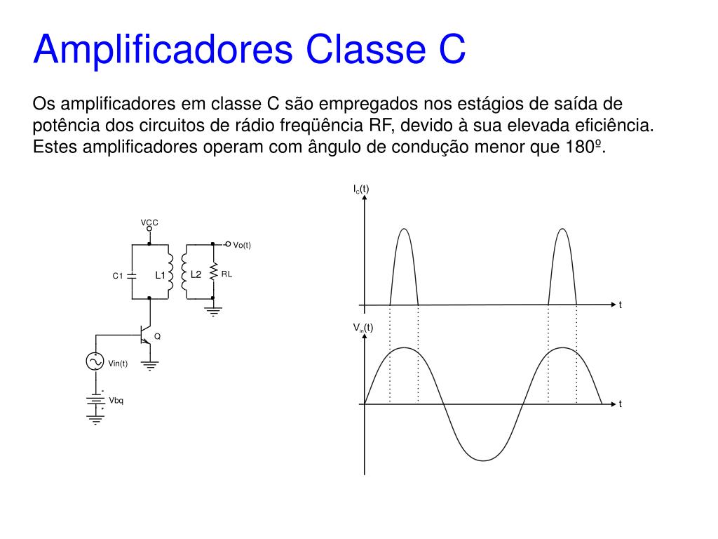 Amplificadores Classe C Os amplificadores em classe C são empregados nos estágios de saída de potência dos circuitos de rádio freqüência RF, devido à sua elevada eficiência. Estes amplificadores operam com ângulo de condução menor que 180º.