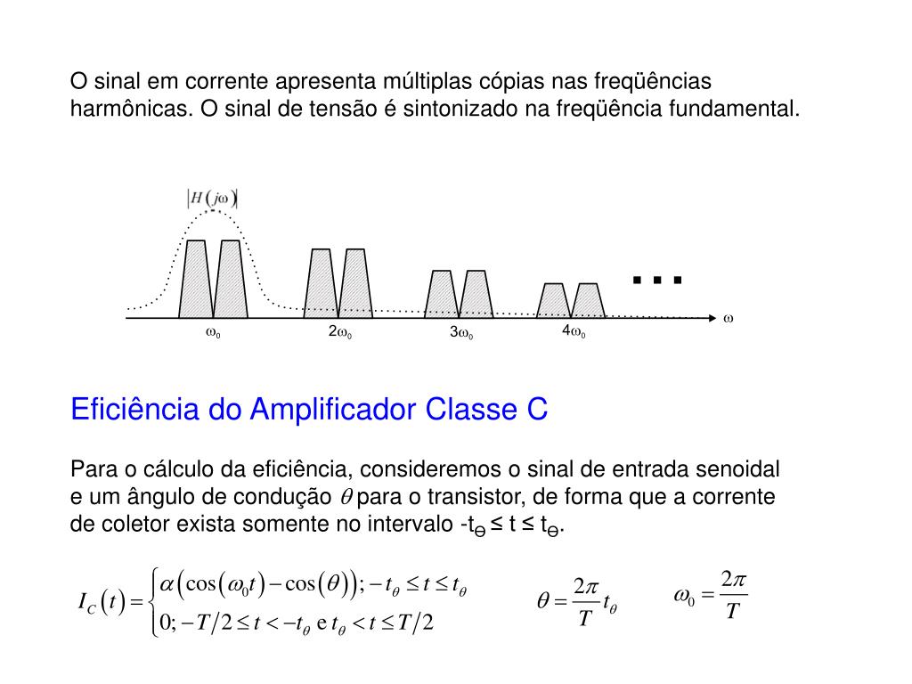 O sinal em corrente apresenta múltiplas cópias nas freqüências harmônicas. O sinal de tensão é sintonizado na freqüência fundamental. Eficiência do Amplificador Classe C Para o cálculo da eficiência, consideremos o sinal de entrada senoidal e um ângulo de condução q para o transistor, de forma que a corrente de coletor exista somente no intervalo -tӨ≤ t ≤ tӨ.