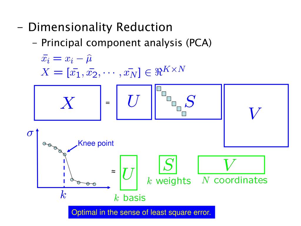 Dimensionality Reduction • Principal component analysis (PCA) = Knee point ≈ Optimal in the sense of least square error.