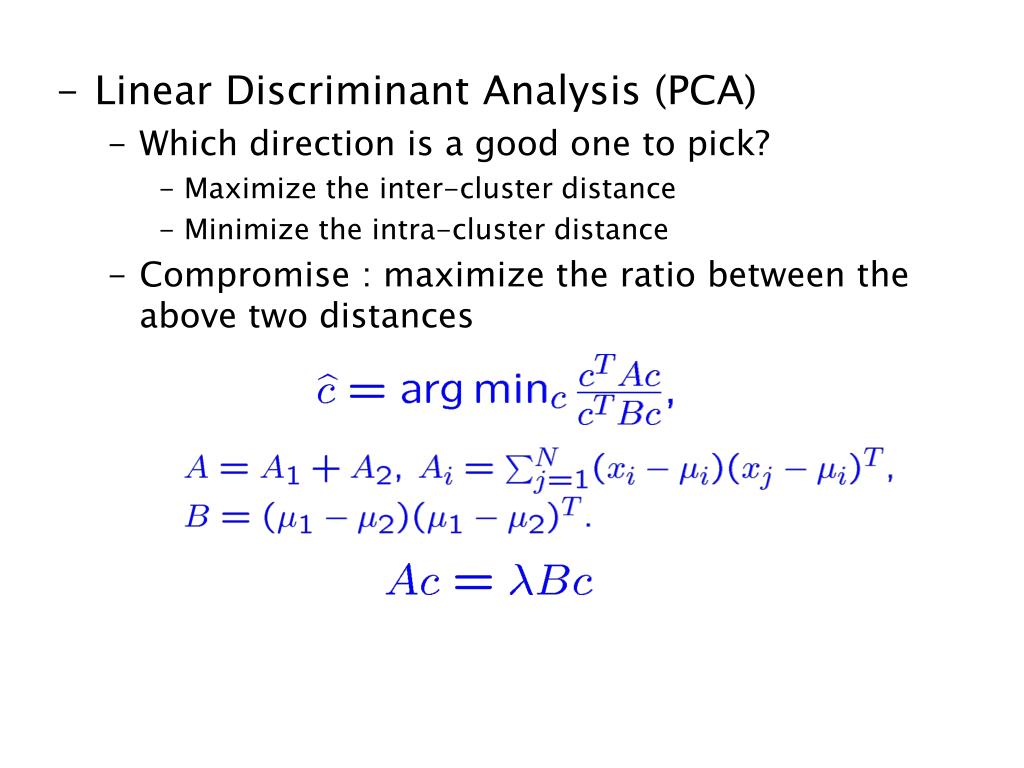 Linear Discriminant Analysis (PCA) • Which direction is a good one to pick? • Maximize the inter-cluster distance • Minimize the intra-cluster distance • Compromise : maximize the ratio between the above two distances