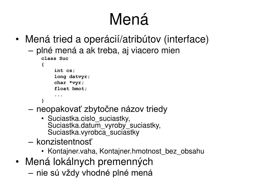 Mená • Mená tried a operácií/atribútov (interface) • plné mená a ak treba, aj viacero mien class Suc { int cs; long datvyr; char *vyr; float hmot; ... } • neopakovať zbytočne názov triedy • Suciastka.cislo_suciastky, Suciastka.datum_vyroby_suciastky, Suciastka.vyrobca_suciastky • konzistentnosť • Kontajner.vaha, Kontajner.hmotnost_bez_obsahu • Mená lokálnych premenných • nie sú vždy vhodné plné mená