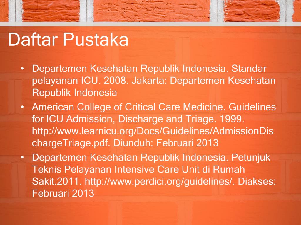 Daftar Pustaka • Departemen Kesehatan Republik Indonesia. Standar pelayanan ICU. 2008. Jakarta: Departemen Kesehatan Republik Indonesia • American College of Critical Care Medicine. Guidelines for ICU Admission, Discharge and Triage. 1999. http://www.learnicu.org/Docs/Guidelines/AdmissionDischargeTriage.pdf. Diunduh: Februari 2013 • Departemen Kesehatan Republik Indonesia. Petunjuk Teknis Pelayanan Intensive Care Unit di Rumah Sakit.2011. http://www.perdici.org/guidelines/. Diakses: Februari 2013