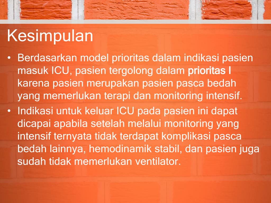 Kesimpulan • Berdasarkan model prioritas dalam indikasi pasien masuk ICU, pasien tergolong dalam prioritas I karena pasien merupakan pasien pasca bedah yang memerlukan terapi dan monitoring intensif. • Indikasi untuk keluar ICU pada pasien ini dapat dicapai apabila setelah melalui monitoring yang intensif ternyata tidak terdapat komplikasi pasca bedah lainnya, hemodinamik stabil, dan pasien juga sudah tidak memerlukan ventilator.