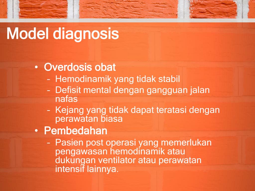 Model diagnosis • Overdosisobat • Hemodinamik yang tidakstabil • Defisit mental dengangangguanjalannafas • Kejang yang tidakdapatteratasidenganperawatanbiasa • Pembedahan • Pasien post operasi yang memerlukanpengawasanhemodinamikataudukungan ventilator atauperawatanintensiflainnya.