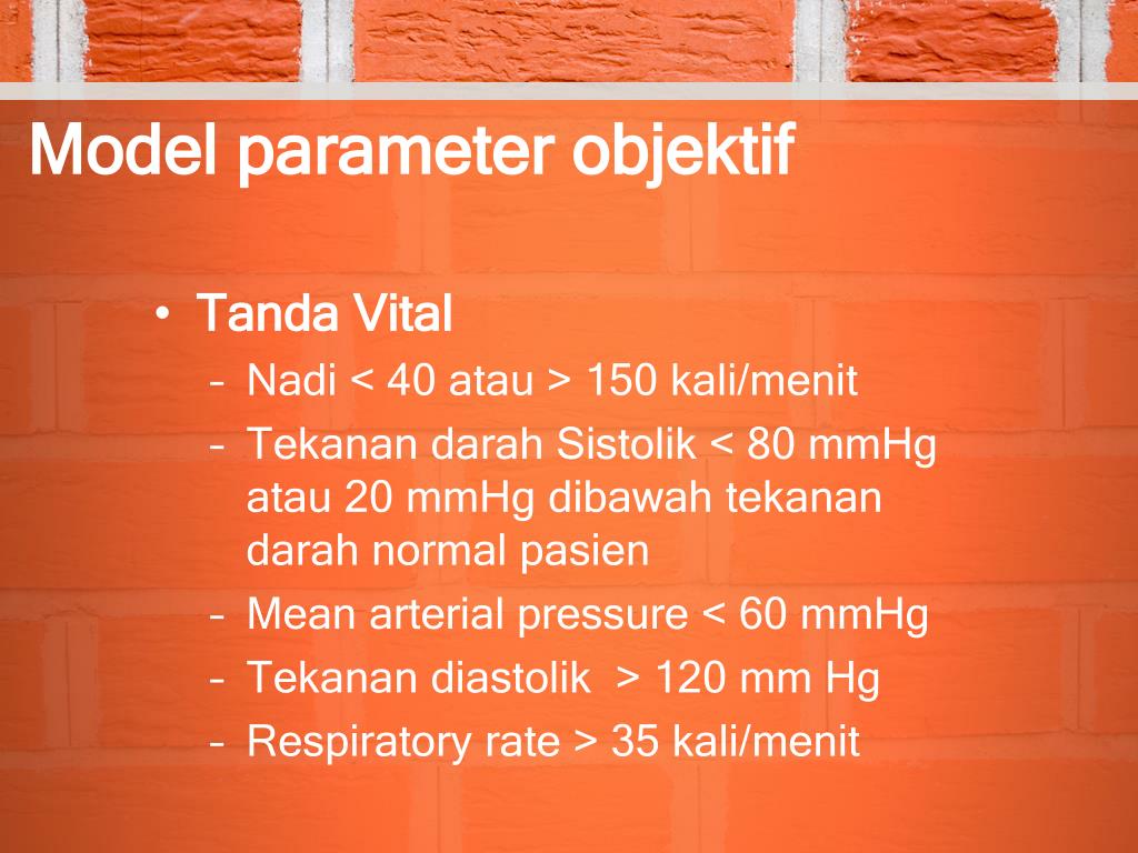 Model parameter objektif • Tanda Vital • Nadi < 40 atau > 150 kali/menit • TekanandarahSistolik < 80 mmHg atau 20 mmHg dibawahtekanandarah normal pasien • Mean arterial pressure < 60 mmHg • Tekanandiastolik > 120 mm Hg • Respiratory rate > 35 kali/menit