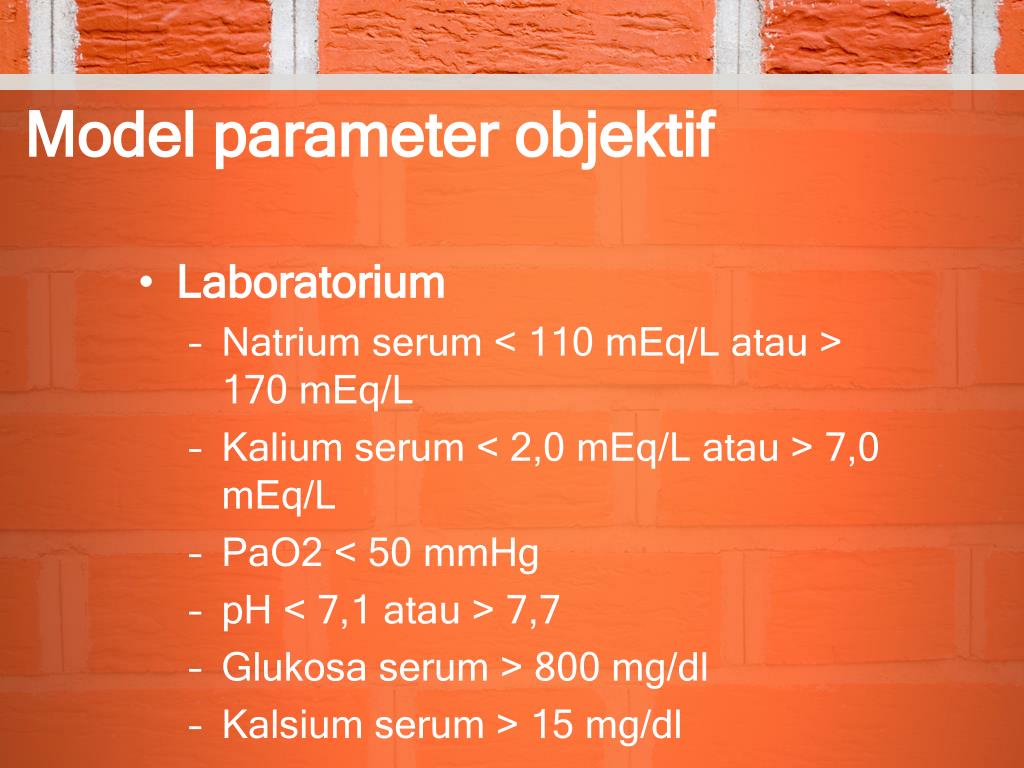 Model parameter objektif • Laboratorium • Natrium serum < 110 mEq/L atau > 170 mEq/L • Kalium serum < 2,0 mEq/L atau > 7,0 mEq/L • PaO2 < 50 mmHg • pH < 7,1 atau > 7,7 • Glukosa serum > 800 mg/dl • Kalsium serum > 15 mg/dl
