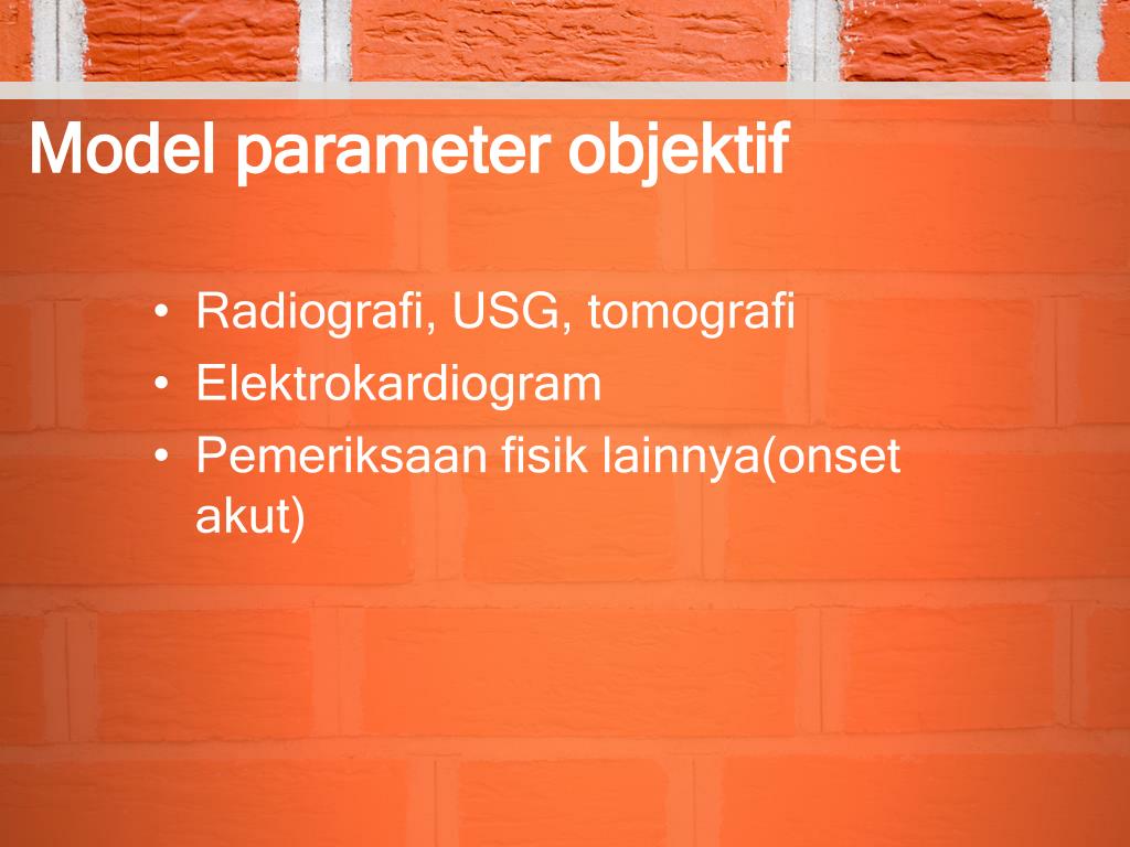 Model parameter objektif • Radiografi, USG, tomografi • Elektrokardiogram • Pemeriksaanfisiklainnya(onset akut)
