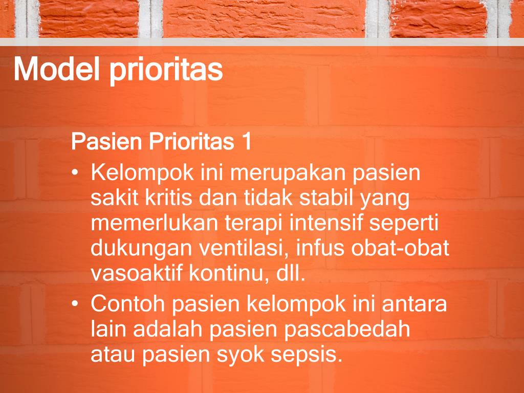 Model prioritas PasienPrioritas 1 • Kelompokinimerupakanpasiensakitkritisdantidakstabil yang memerlukanterapiintensifsepertidukunganventilasi, infusobat-obatvasoaktifkontinu, dll. • Contohpasienkelompokiniantara lain adalahpasienpascabedahataupasiensyok sepsis.