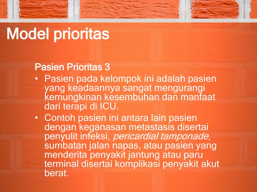 Model prioritas PasienPrioritas 3 • Pasienpadakelompokiniadalahpasien yang keadaannyasangatmengurangikemungkinankesembuhandanmanfaatdariterapidiICU. • Contohpasieniniantara lain pasiendengankeganasan metastasis disertaipenyulitinfeksi, pericardial tamponade, sumbatanjalannapas, ataupasien yang menderitapenyakitjantungatauparu terminal disertaikomplikasipenyakitakutberat.
